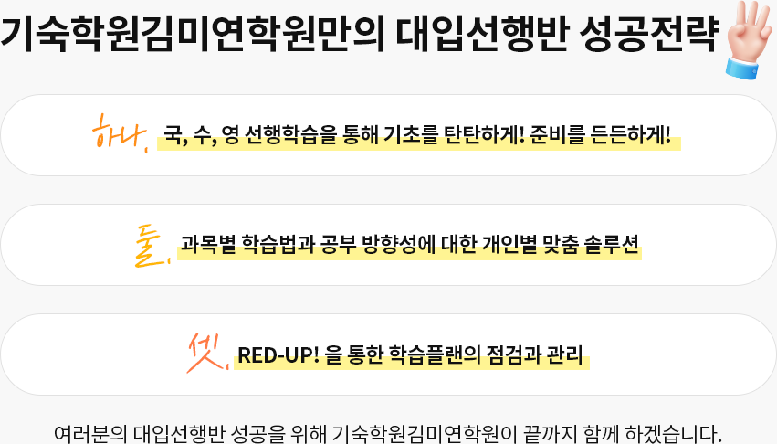 기숙학원김미연학원은 선행반 학생들을 체계적으로 관리하여 이들의 꿈을 이룰 수 있도록 함께하겠습니다.