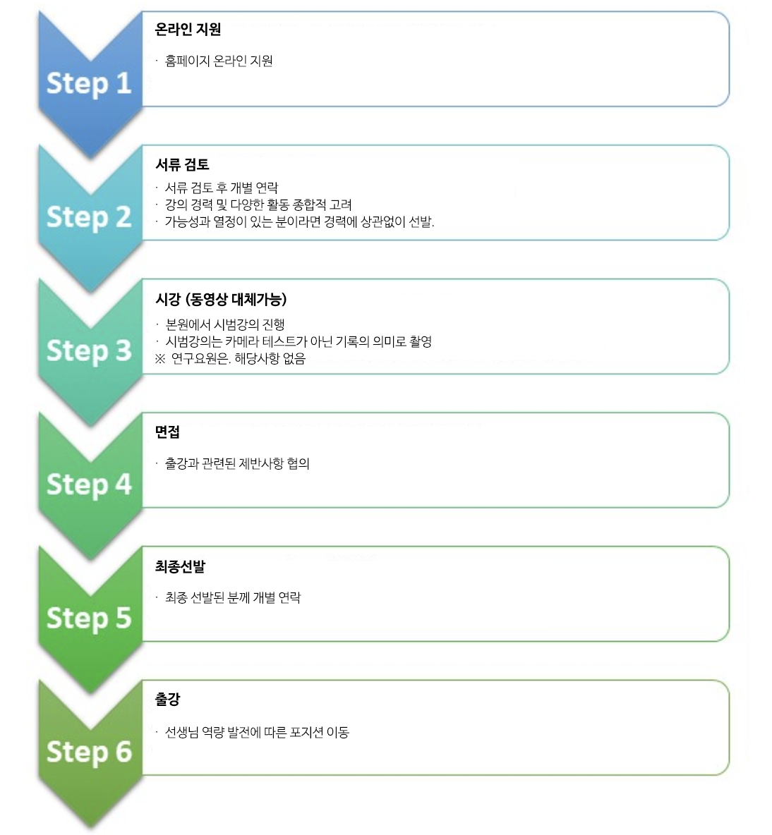 1. 강사지원서(자사양식) 2. 강의계획서 및 자기소개서(자유양식) 3. 시강(동영상 업로드 대체가능) 4. 면접